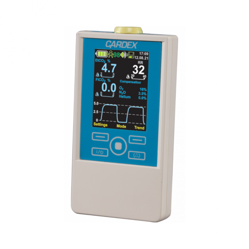 КАРДЕКС МАР-02 позволяет в реальном времени отслеживать содержание CO₂, что является золотым стандартом для подтверждения правильного положения эндотрахеальной трубки, оценки эффективности искусственной вентиляции легких (ИВЛ) и раннего выявления таких опасных состояний, как гиповентиляция, апноэ или нарушение кровообращения.