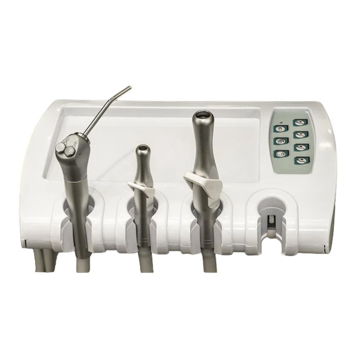Ассистентский блок включает слюноотсос, пылесос, пистолет вода-воздух, а также лампу полимеризации. Управление осуществляется с панели, обеспечивая простоту в использовании и эффективное сотрудничество медперсонала.
