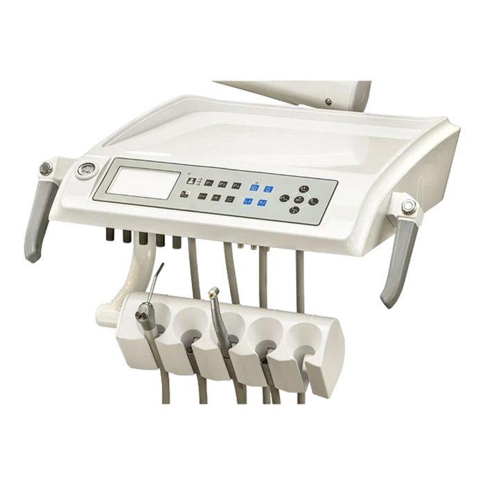 AY-A 1000 - это стоматологическая установка, специально адаптированная к требованиям российских стандартов. Она оснащена системой нижней подачи приборов, выходами М40, а также пистолетом для воздушно-водяной смеси, обеспечивая стоматологу удобство и эффективность работы.