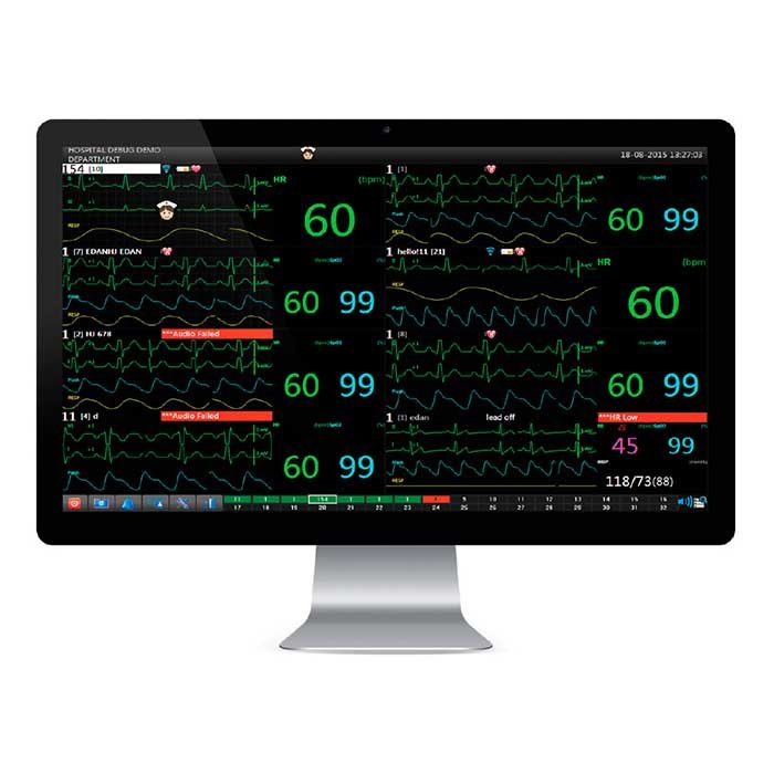 - Централизованный мониторинг: Отображение данных (ЭКГ, частота дыхания, сатурация, артериальное давление и др.) с нескольких прикроватных мониторов на одном большом экране.