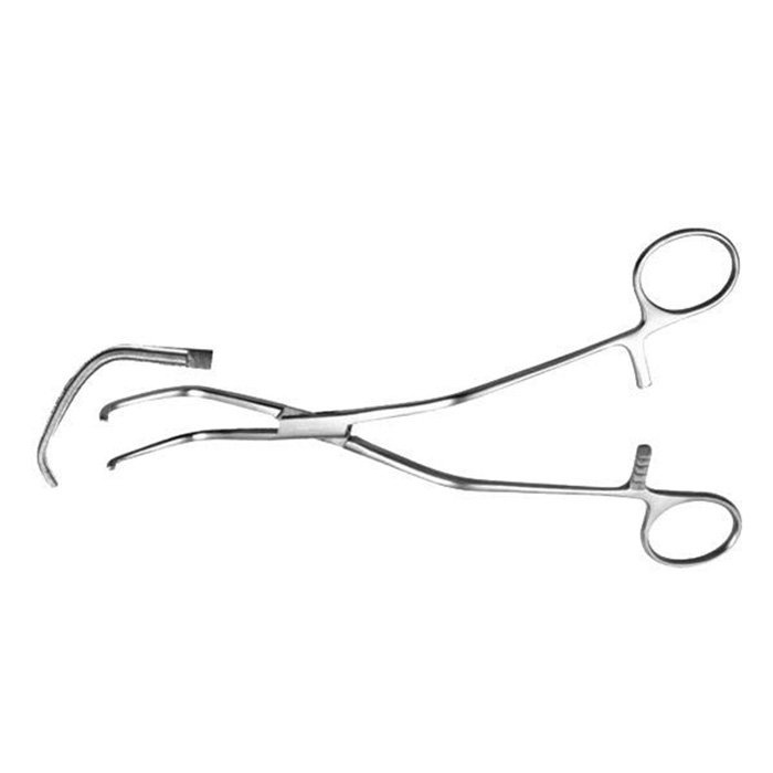 Изогнутая бранша и атравматичные зубцы обеспечивают надежный захват ткани без ее повреждения, а механизм кремальеры позволяет точно дозировать усилие сжатия и надежно фиксировать инструмент в рабочем положении.